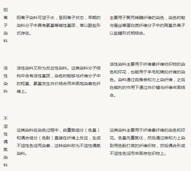 分為:直接染料、酸性染料、陽(yáng)離子染料、活性染料、不溶性偶氮染料、分散染料、還原染料、硫化染料、縮聚染料、熒光增白劑,此外,還有用于紡織品的氧化染料(如苯胺黑)、溶劑染料、丙綸染料以及用于食品的食用色素等。